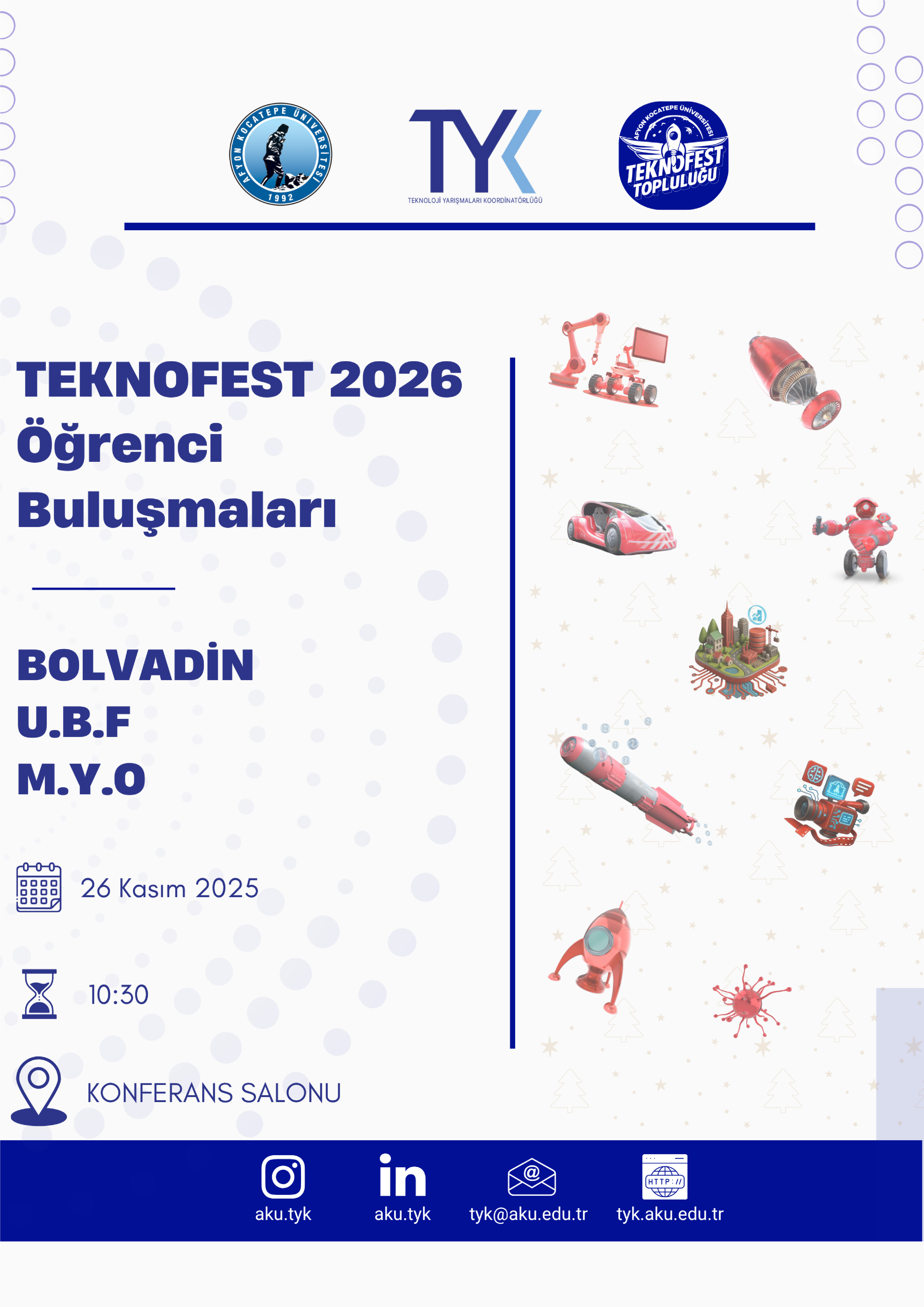 Afyon Kocatepe Üniversitesi Teknoloji Yarışmaları Koordinatörlüğü tarafından düzenlenecek TEKNOFEST 2026 Bilgilendirme Toplantısı, 26 Kasım 2025 Çarşamba günü saat 10.30’da Bolvadin Uygulamalı Bilimler Yüksekokulu Konferans Salonu’nda gerçekleştirilecektir.