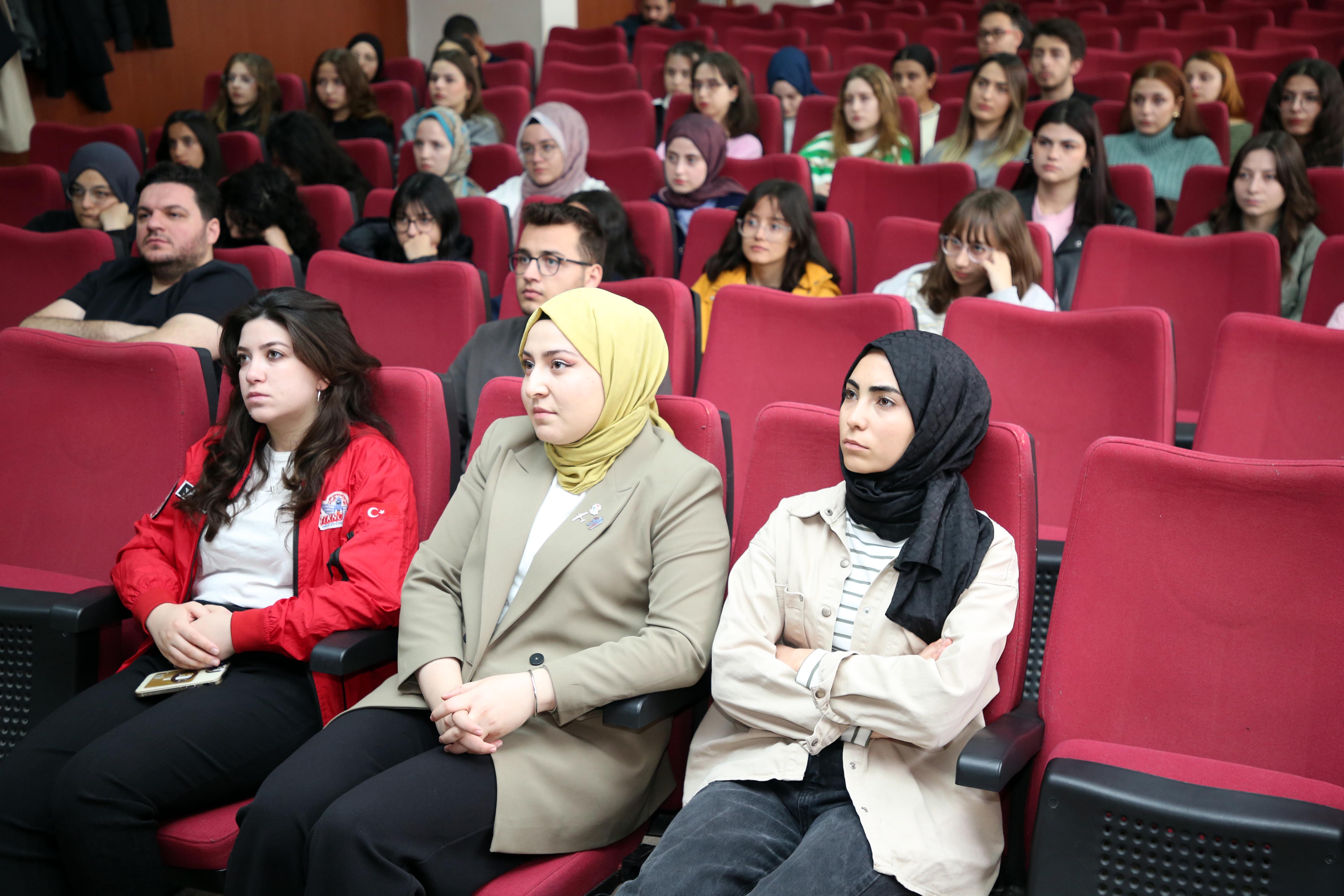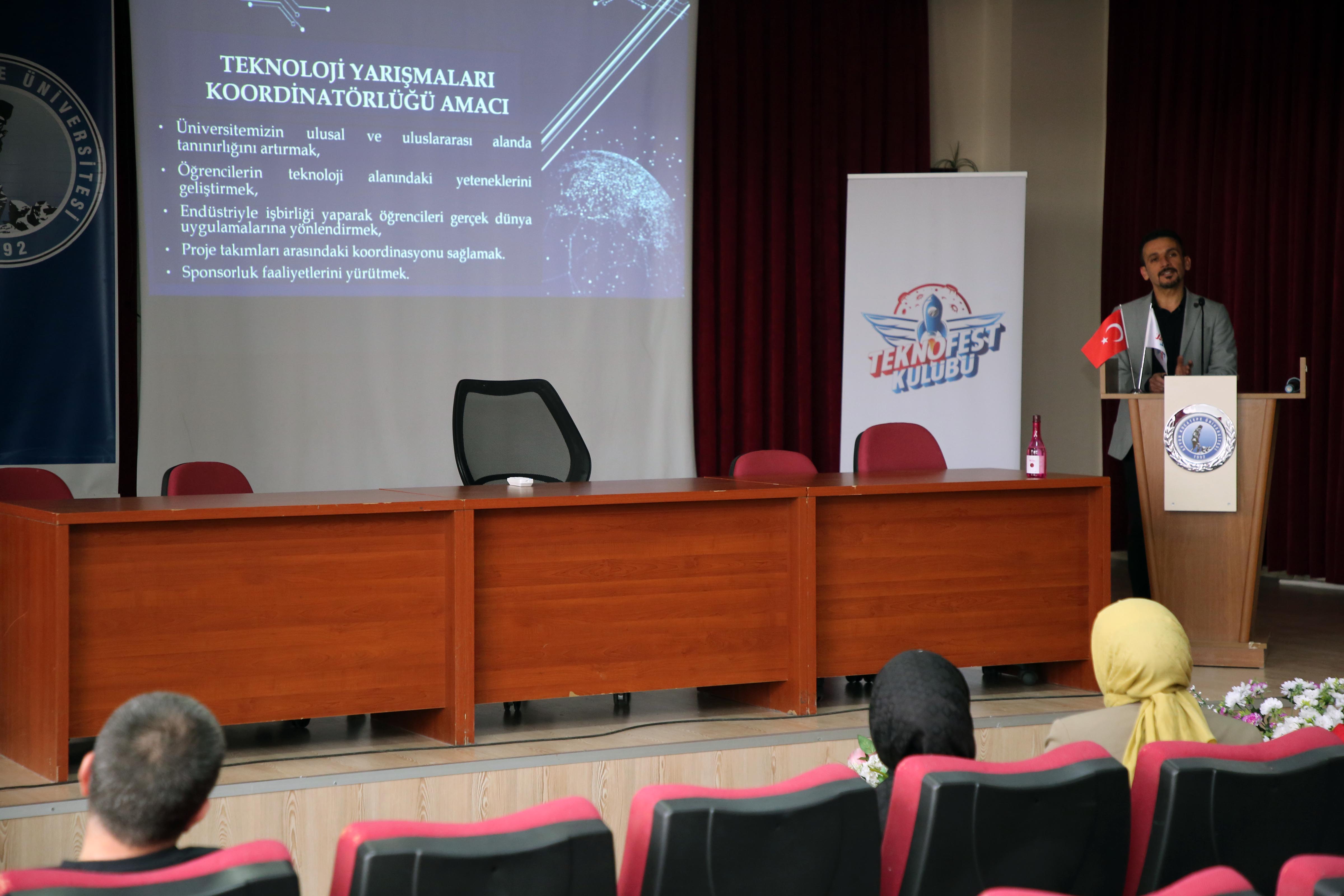 Abdullah Kaptan Konferans Salonunda düzenlenen öğrenci buluşmaları etkinliğinde; Teknoloji Yarışmaları Koordinatörü Dr. Öğretim Üyesi Ahmet Kaysal ve Türkiye Teknoloji Takımı Vakfı Afyonkarahisar İl Sorumlusu Doç. Dr. Mustafa Yalçın Eğitim Fakültesi ve Fen Edebiyat Fakültesi öğrencilerine TEKNOFEST süreçlerine dair bilgiler verdi.